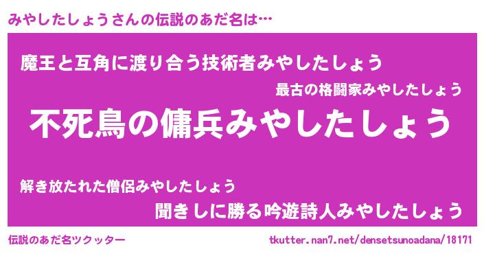 | 男性向けラノベタイトル風あだ名 | 『転生したらみやしたしょうだった件』 |