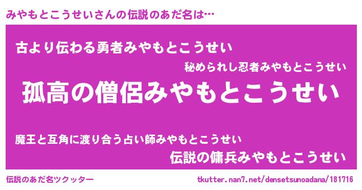 | 男性向けラノベタイトル風あだ名 | 『ダンジョンにみやもとこうせいを求めるのは間違っているだろうか』 |