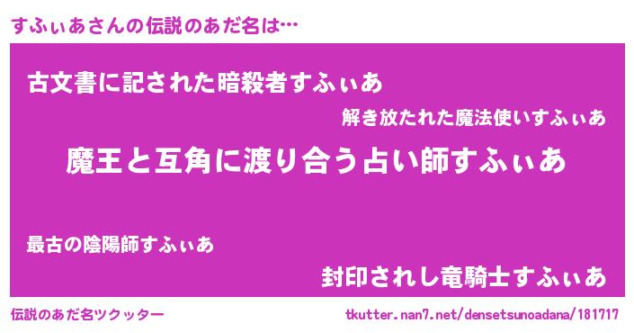| 意味不明あだ名 | 『自称すふぃあ』『永久保存すふぃあ』 |