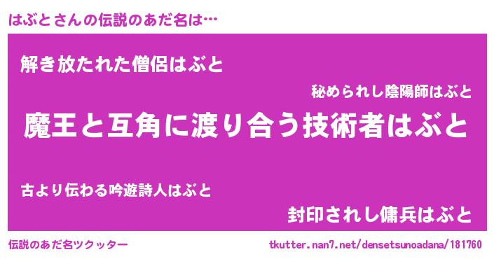 | 男性向けラノベタイトル風あだ名 | 『はぶとに滅ぼされるだけの簡単なお仕事です』 |