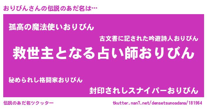 | ヒーロー風カッコイイあだ名 | 『慈愛の使者おりびん』『暗黒騎士オリ』 |