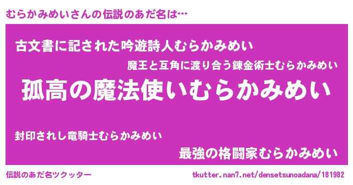 | 意味不明あだ名 | 『とにかく怪しいむらかみめい』 |