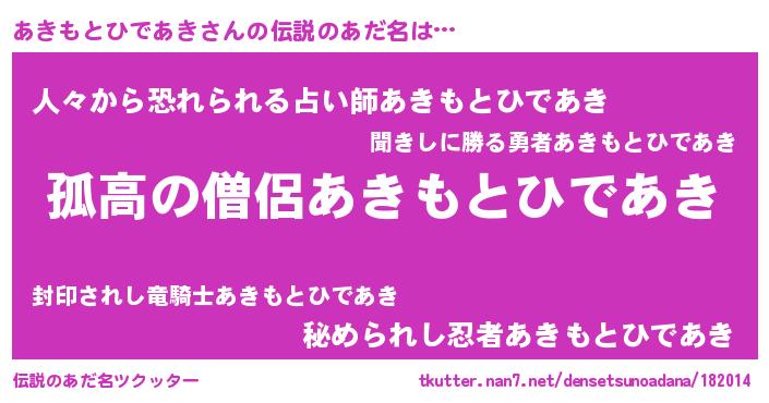 | 男性向けラノベタイトル風あだ名 | 『アキモトヒデアキスレイヤー』 |