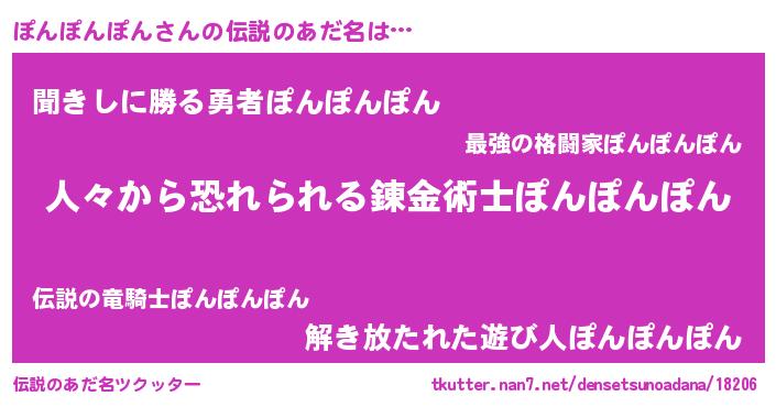 | 男性向けラノベタイトル風あだ名 | 『おまえをオタクにしてやるから、俺をぽんぽんぽんにしてくれ! 』 |