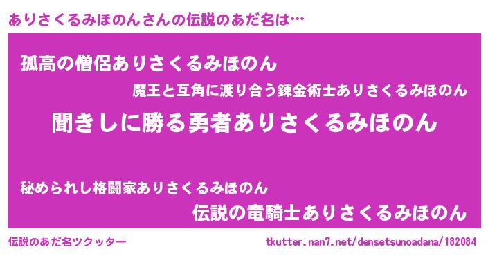 | 男性向けラノベタイトル風あだ名 | 『アリサクルミホノンスレイヤー』 |