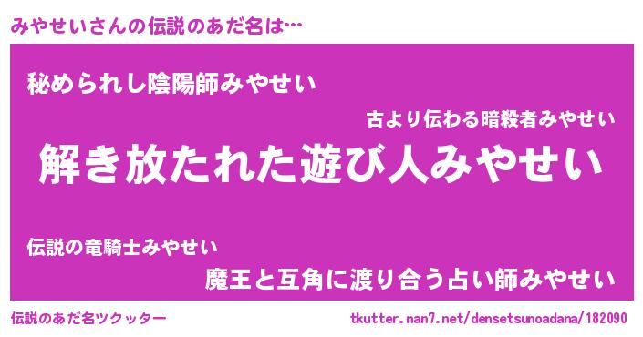 | 男性向けラノベタイトル風あだ名 | 『転生したらみやせいだった件』 |