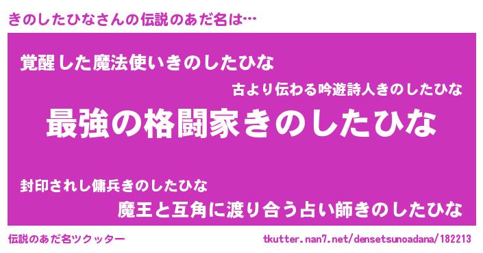 | 男性向けラノベタイトル風あだ名 | 『きのしたひな~年齢イコール彼女いない歴の魔法使い~』 |