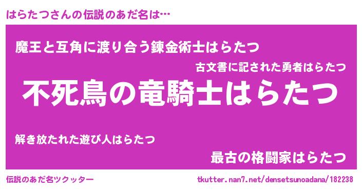 | ヒーロー風カッコイイあだ名 | 『スーパーハラタツ』『仮面ハラダー』 |