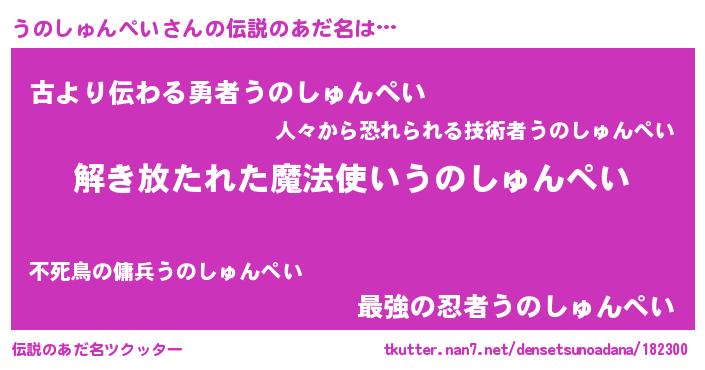 | 男性向けラノベタイトル風あだ名 | 『うのしゅんぺいに滅ぼされるだけの簡単なお仕事です』 |