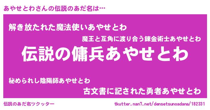 | 肩書あだ名 | 『あやせとわ中尉』『あやせとわ社長』 |
