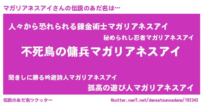| 男性向けラノベタイトル風あだ名 | 『転生したらマガリアネスアイだった件』 |