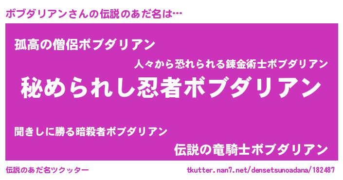 | 男性向けラノベタイトル風あだ名 | 『魔弾の王とボブダリアン』 |