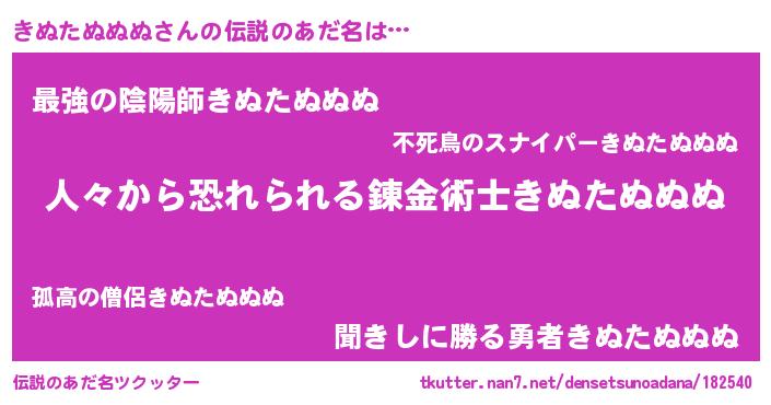 | 男性向けラノベタイトル風あだ名 | 『おまえをオタクにしてやるから、俺をきぬたぬぬぬにしてくれ! 』 |