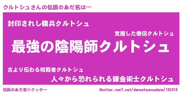 | 男性向けラノベタイトル風あだ名 | 『クルトシュに滅ぼされるだけの簡単なお仕事です』 |