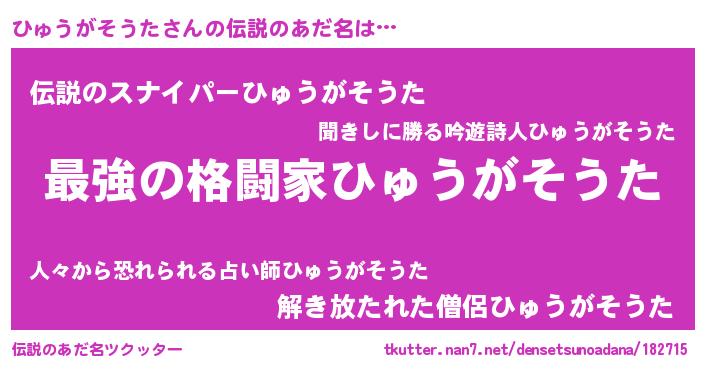 | 男性向けラノベタイトル風あだ名 | 『ひゅうがそうたに滅ぼされるだけの簡単なお仕事です』 |