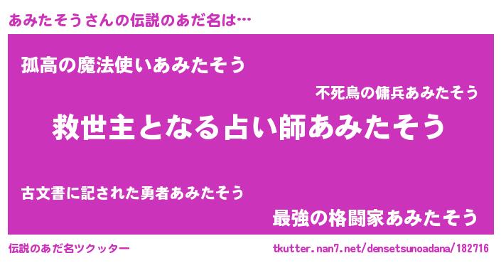 | 男性向けラノベタイトル風あだ名 | 『この素晴らしい世界にあみたそうを!』 |