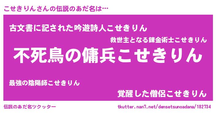 | 女子向けラノベタイトル風あだ名 | 『こせきりん姫と円卓の騎士』 |