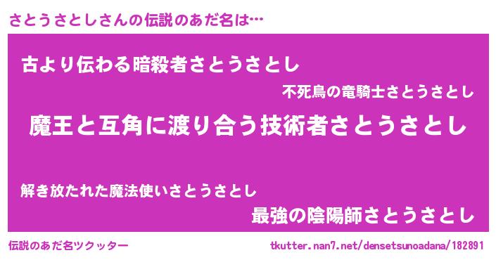 | 男性向けラノベタイトル風あだ名 | 『魔弾の王とさとうさとし』 |