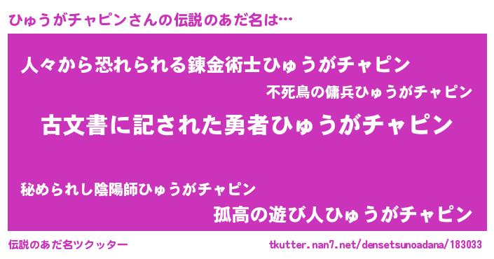 | 男性向けラノベタイトル風あだ名 | 『うちのひゅうがチャピンが世界を掌握している!』 |