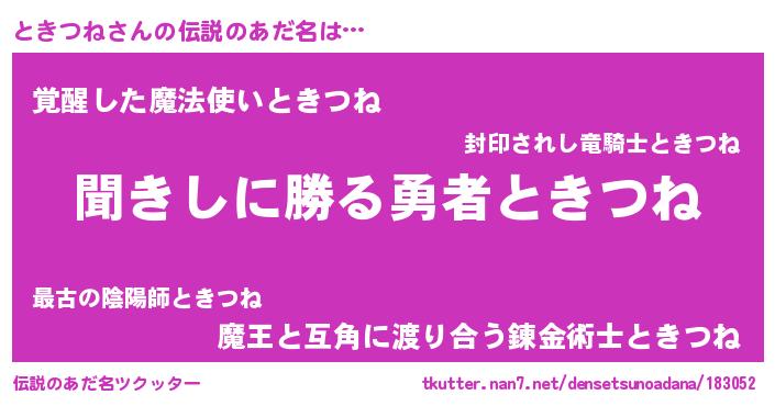 | ヒーロー風カッコイイあだ名 | 『ネオトキツネ』『最強戦士トキツネ』 |