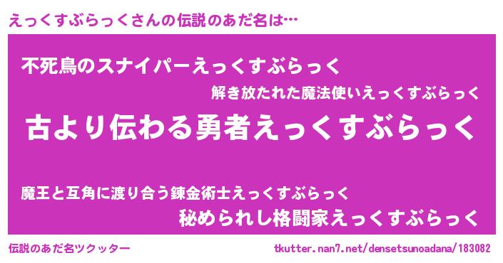 | 胡散臭い通販商品みたいなあだ名 | 『来世でも幸せになれる水素水…その名も「えっくすぶらっく」』 |