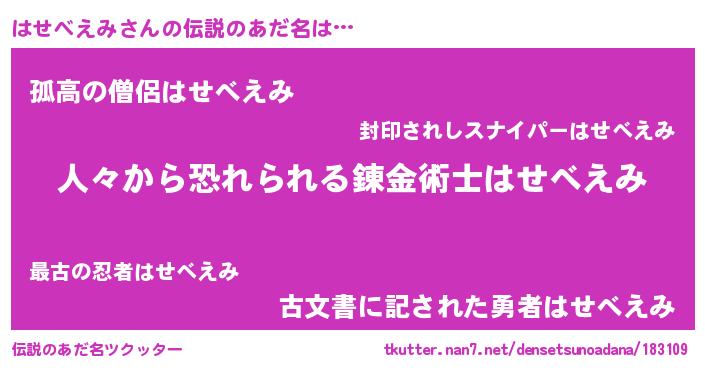 | 男性向けラノベタイトル風あだ名 | 『おまえをオタクにしてやるから、俺をはせべえみにしてくれ! 』 |