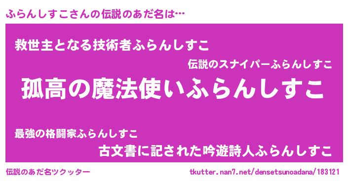 | ヘコむあだ名 | 『ふら太郎』『ふらんしすこ(小並感)』 |