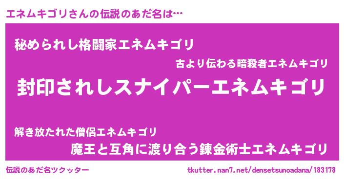 | ヒーロー風カッコイイあだ名 | 『スーパーエネムキゴリ』『仮面エネダー』 |