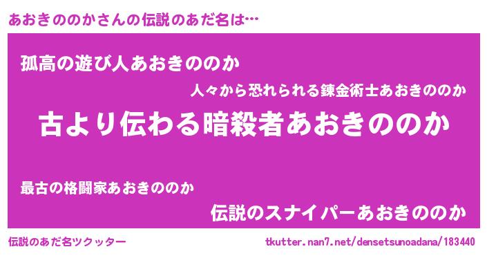 | 男性向けラノベタイトル風あだ名 | 『Re:あおきののかから始める異世界生活』 |
