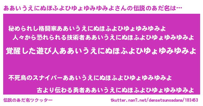 | 意味不明あだ名 | 『とにかく怪しいああいうえにぬほふよひゆょゆみゆみよ』 |