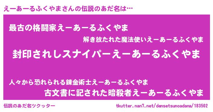 | 意味不明あだ名 | 『住所不定無職えーあーるふくやま(74歳)』 |