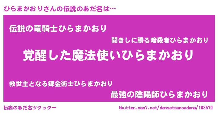 | ヒーロー風カッコイイあだ名 | 『炎刃騎士ヒラ』『スーパーヒラマカオリ』 |