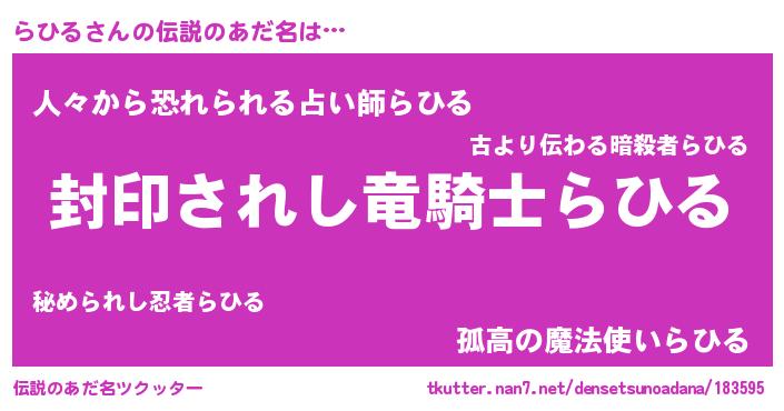 | 男性向けラノベタイトル風あだ名 | 『らひる~年齢イコール彼女いない歴の魔法使い~』 |