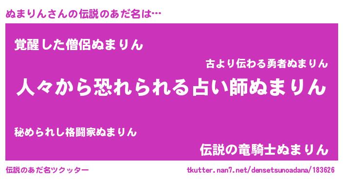 | 男性向けラノベタイトル風あだ名 | 『おまえをオタクにしてやるから、俺をぬまりんにしてくれ! 』 |