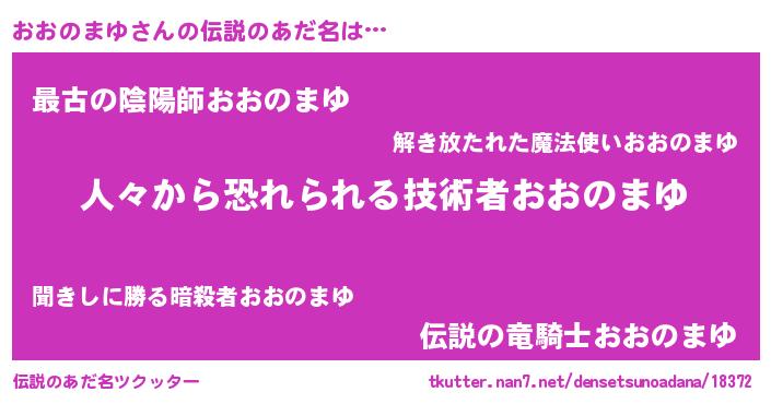 | 男性向けラノベタイトル風あだ名 | 『おまえをオタクにしてやるから、俺をおおのまゆにしてくれ! 』 |