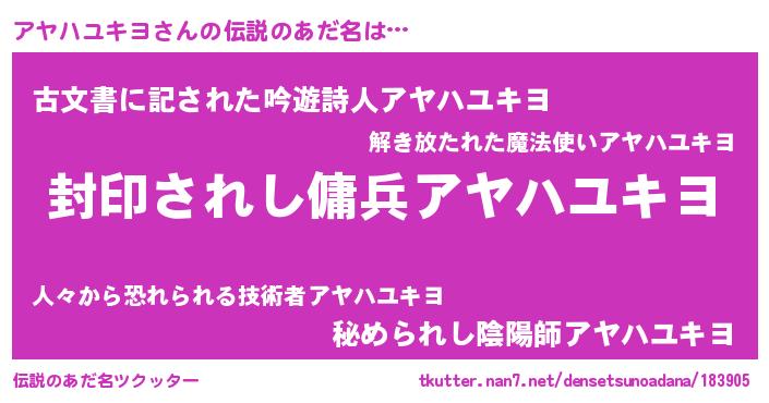 | ヒーロー風カッコイイあだ名 | 『スーパーアヤハユキヨ』『幻影騎士アヤ』 |