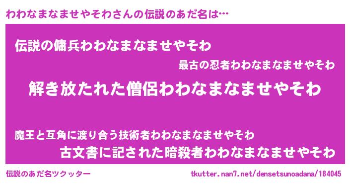 | 女子向けラノベタイトル風あだ名 | 『わわなまなませやそわの卵を拾いまして』 |