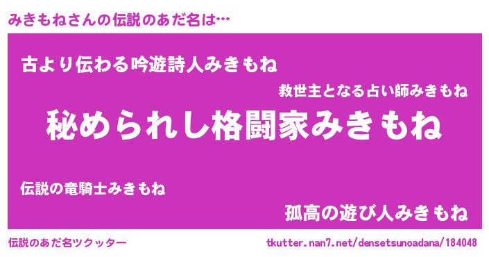 | ヒーロー風カッコイイあだ名 | 『ウルトラみきもねマン』『ネオミキモネ』 |