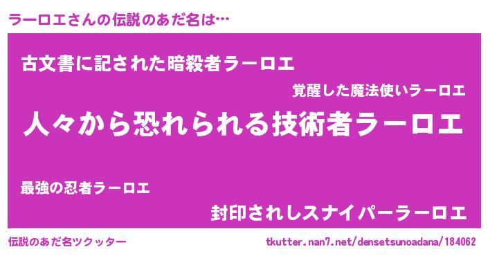 | ヘコむあだ名 | 『ラーロエ(小並感)』『ラーもー』 |