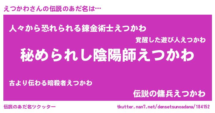 | 意味不明あだ名 | 『自称えつかわ』『めかぶ科えつかわ属』 |