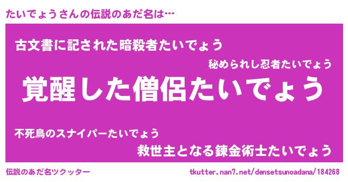 | ヒーロー風カッコイイあだ名 | 『究極戦士タイデョウ』『天弓騎士タイ』 |