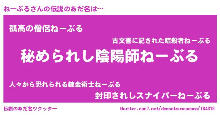 | 女子向けラノベタイトル風あだ名 | 『ねーぶるの雑貨屋さん』『闇のねーぶる』 |