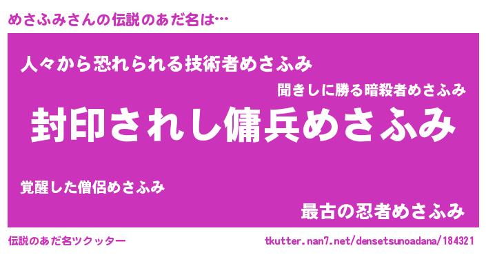 | 男性向けラノベタイトル風あだ名 | 『めさふみに滅ぼされるだけの簡単なお仕事です』 |