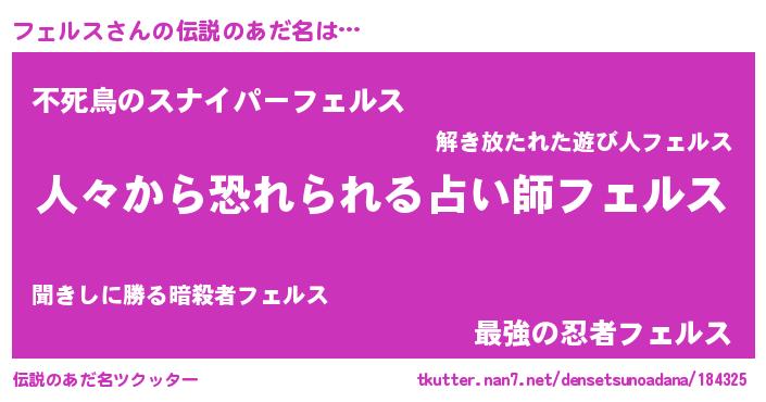| 男性向けラノベタイトル風あだ名 | 『おまえをオタクにしてやるから、俺をフェルスにしてくれ! 』 |
