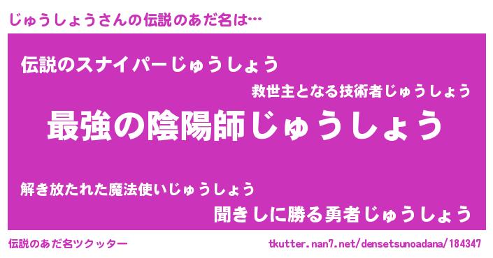 | 男性向けラノベタイトル風あだ名 | 『じゅうしょうに滅ぼされるだけの簡単なお仕事です』 |