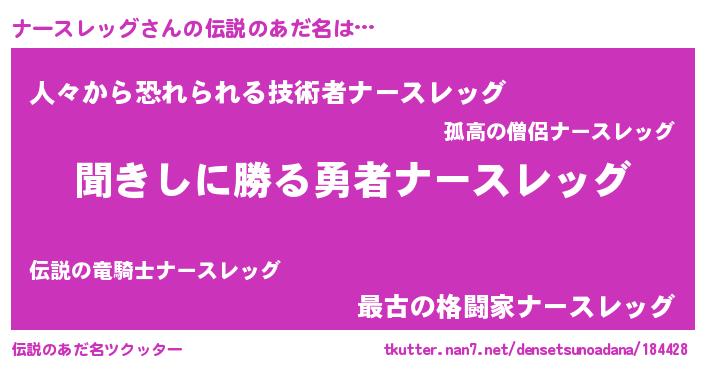 | 男性向けラノベタイトル風あだ名 | 『はたらくナースレッグさま!』 |