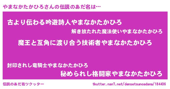 | 男性向けラノベタイトル風あだ名 | 『転生したらやまなかたかひろだった件』 |