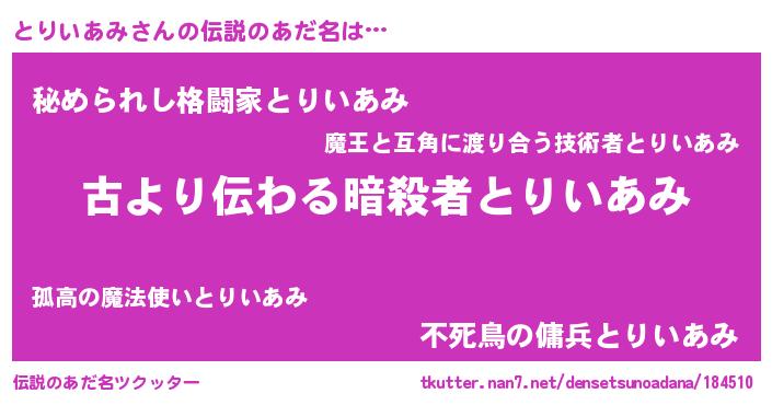 | 女子向けラノベタイトル風あだ名 | 『乙女ゲームの破滅フラグしかない悪役とりいあみに転生してしまった…』 |