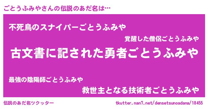 | ヒーロー風カッコイイあだ名 | 『究極戦士ゴトウフミヤ』『天弓騎士ゴト』 |