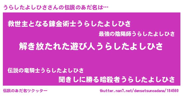 | 男性向けラノベタイトル風あだ名 | 『転生したらうらしたよしひさだった件』 |